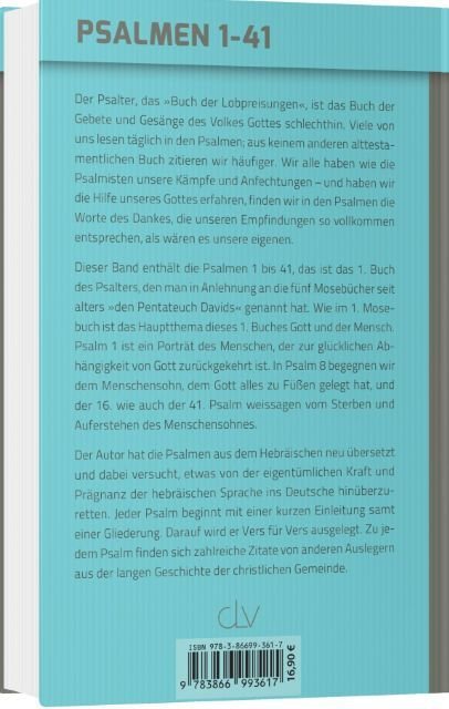 Dieser Band enthält die Psalmen 1 bis 41, das ist das 1. Buch des Psalters, den man in Anlehnung an die fünf Mosebücher seit alters »den Pentateuch Davids« genannt hat. Wie im 1. Mosebuch ist das Hauptthema dieses 1. Buches Gott und der Mensch. Psalm 1 ist ein Porträt des Menschen, der zur glücklichen Abhängigkeit von Gott zurückgekehrt ist. In Psalm 8 begegnen wir dem Menschensohn, dem Gott alles zu Füßen gelegt hat, und der 16. wie auch der 41. Psalm weissagen vom Sterben und Auferstehen des Menschensohnes.