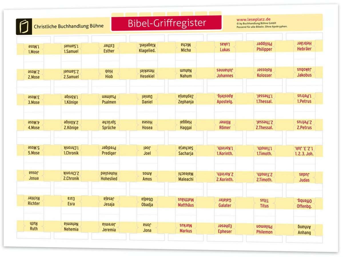 Ein universelles Bibel-Griffregister für alle gängigen Bibelausgaben. Mit praktischer Einklebeschablone auf der Rückseite.